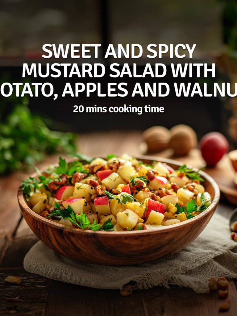 In a large mixing bowl, combine the halved baby potatoes, cubed apple, thinly sliced onion, and walnuts.
